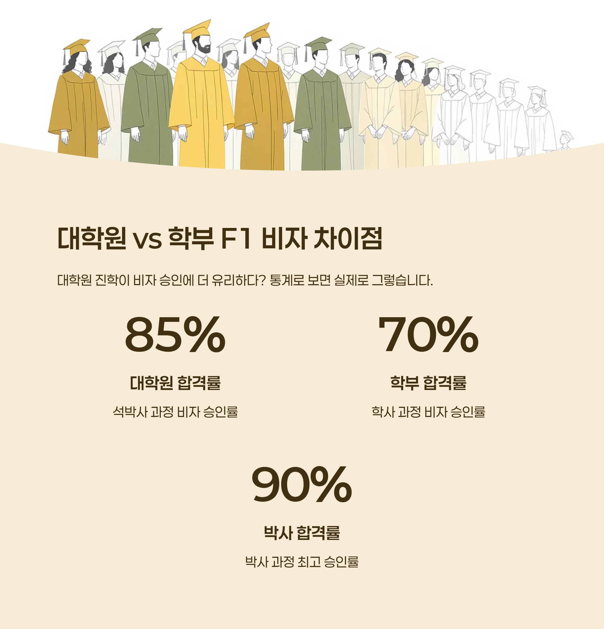 미국 국무부 데이터에 따르면, 2023년 기준 대학원 과정 F1 비자 승인률은 약 85-90%인 반면, 학부 과정은 70-80% 수준을 보였습니다. 이런 차이가 나는 이유는 무엇일까요?