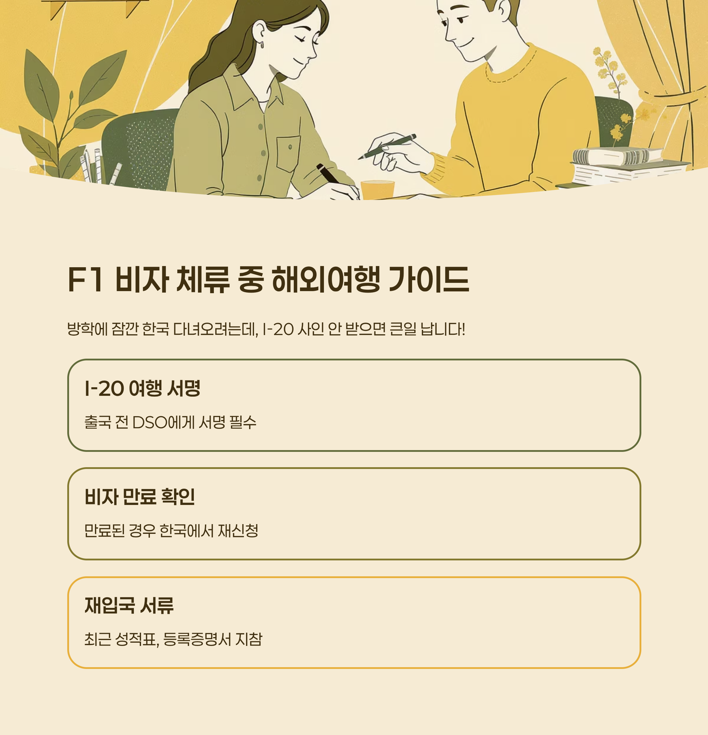 F1 비자로 체류하면서 여행을 계획한다는 것, 생각보다 신경 쓸 게 많죠? 하지만 미리 준비만 잘 해둔다면 전혀 문제없습니다. 저도 이제는 익숙해져서 매번 순조롭게 여행을 다녀오고 있어요.